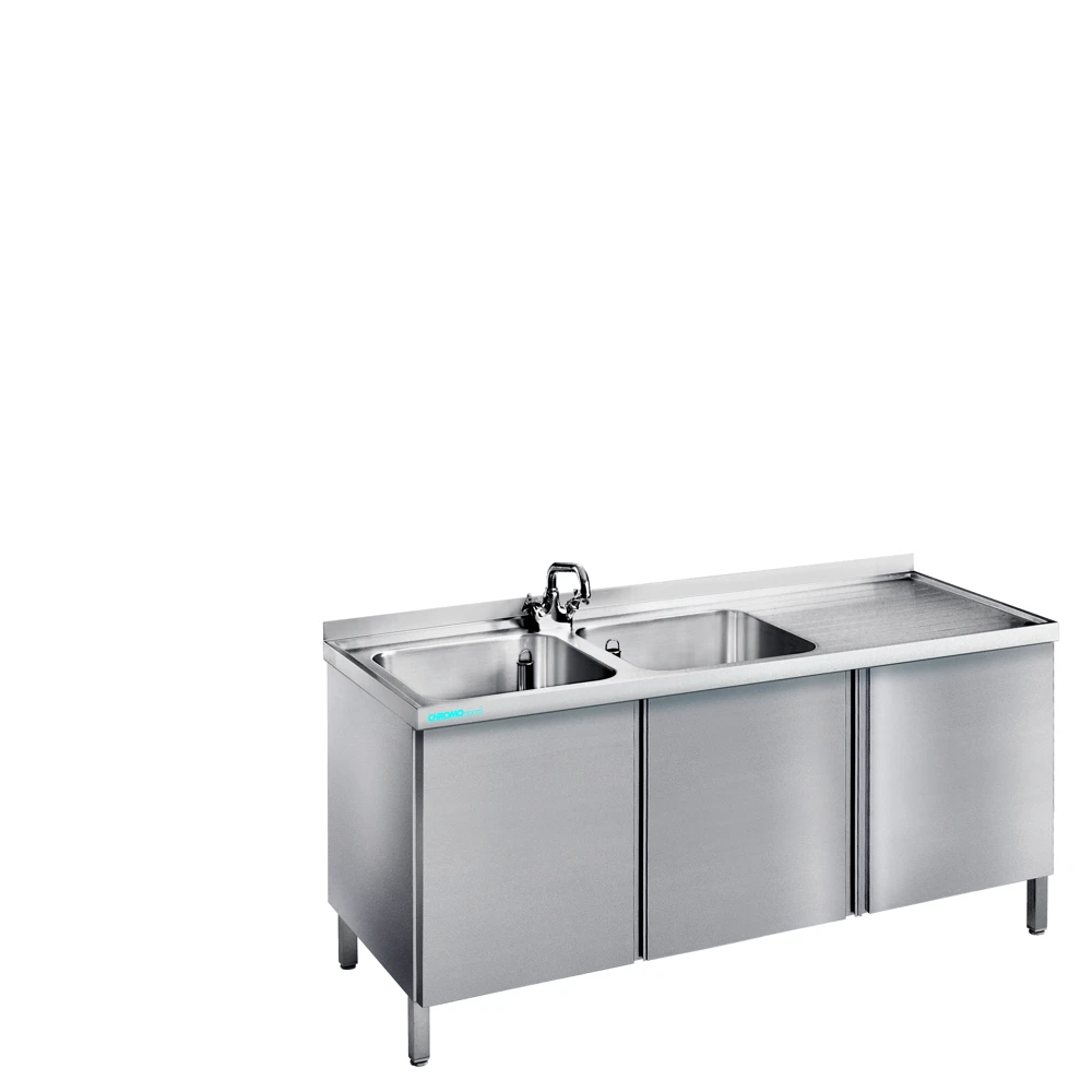 Mit seiner durchdachten Konstruktion ist dieser Spültisch für den täglichen Einsatz in anspruchsvollen Küchenumgebungen konzipiert und passt perfekt in jede professionelle Kücheneinrichtung. Setzen Sie auf Qualität und Funktionalität mit unserem Spültisch mit 2 Becken links und Flügeltüren.